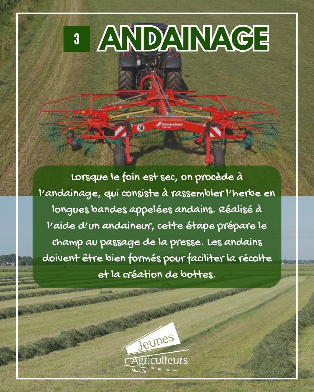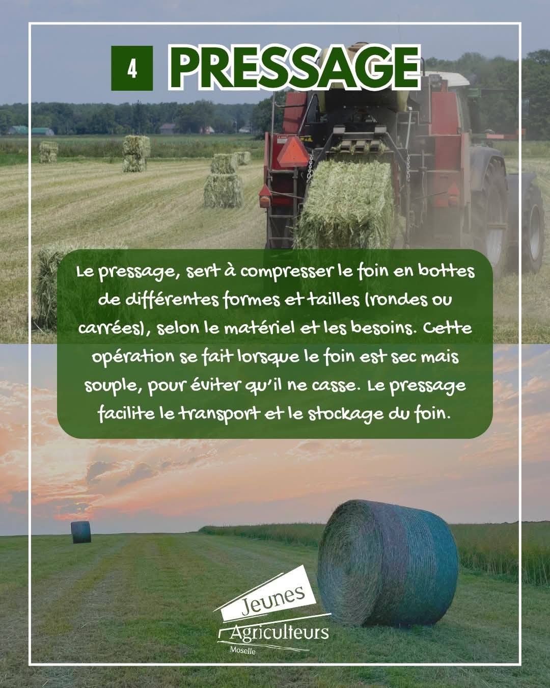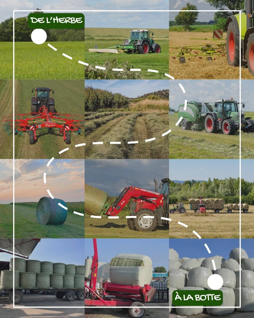 Les prairies sont en pleine transformation : l’herbe est coupée, séchée et mise en bottes pour devenir du foin, une alimentation naturelle et locale pour les animaux.